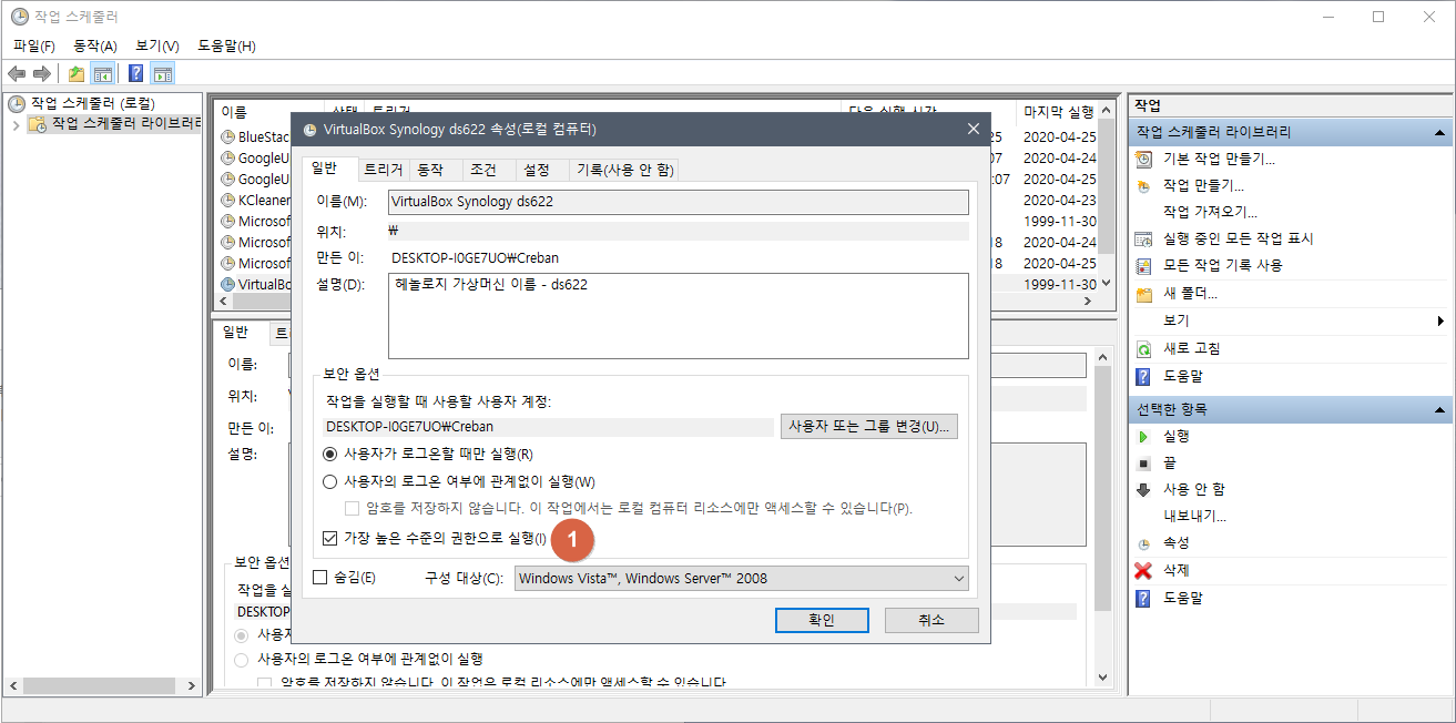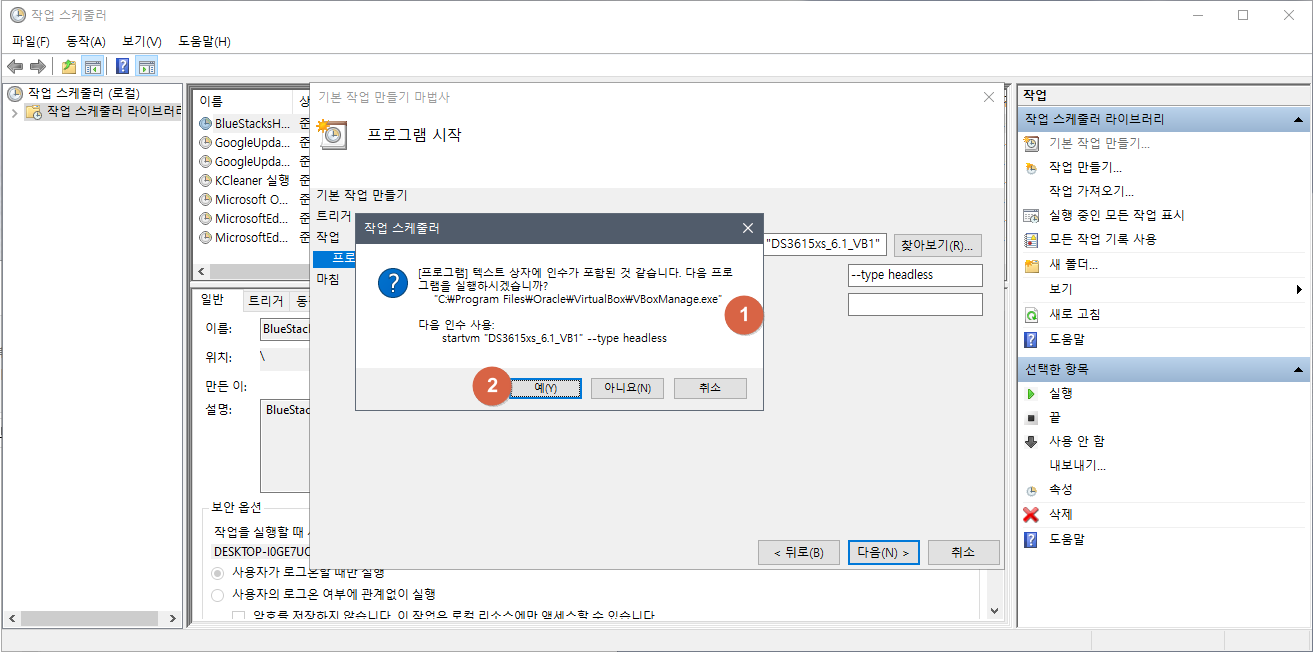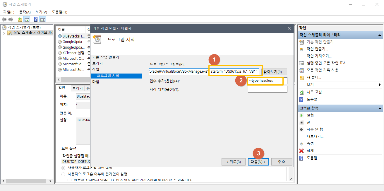 프로그램 및 인수: "C:\Program Files\Oracle\VirtualBox\VBoxManage.exe" startvm "DS3615xs_6.1_VB1" --type headless