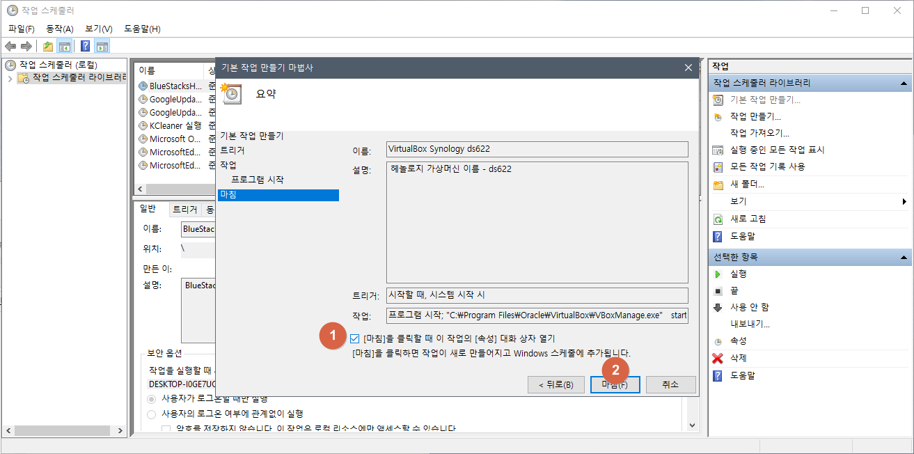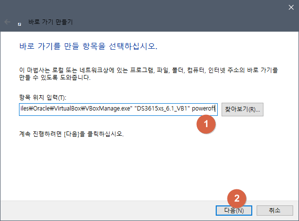 ② 항목위치에 "C:\Program Files\Oracle\VirtualBox\VBoxManage.exe" "DS3615xs_6.1_VB1" poweroff 입력