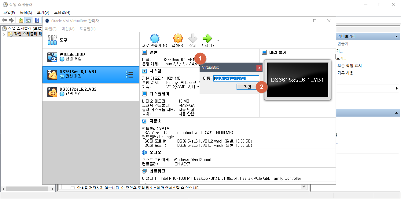 VirtualBox 헤놀로지 가상머신 이름은 DS3615xs_6.1_VB1 이다.