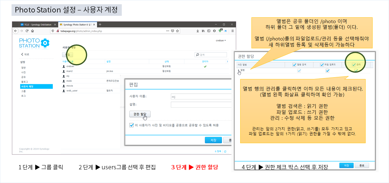 포토 스테이션 그룹 또는 사용자에게 열람, 업로드, 관리 권한을 줄 수 있으며,