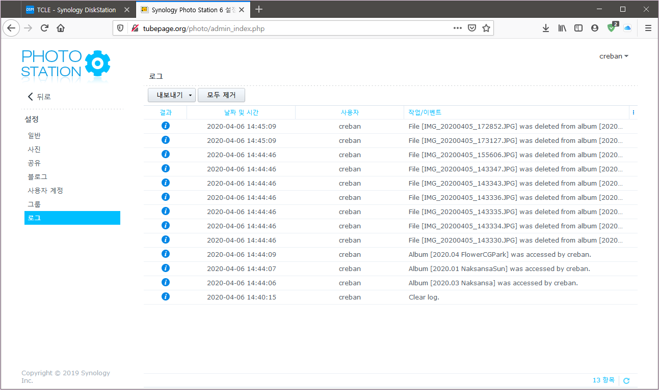 - 포토 스테이션 및 앨범 관리 로그를 확인할 수 있습니다.