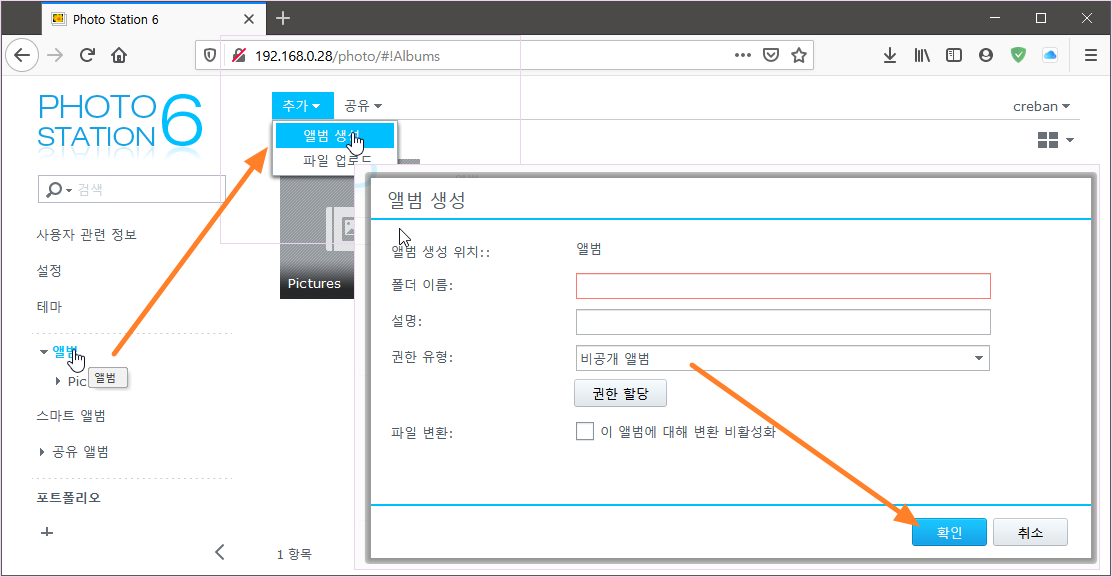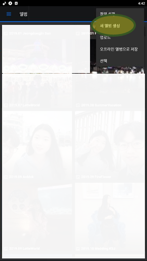 ② 앨범 클릭 --> 추가 --> 앨범 생성 --> 폴더명을 적고 권한 유형은 비공개 앨범으로 하고 확인