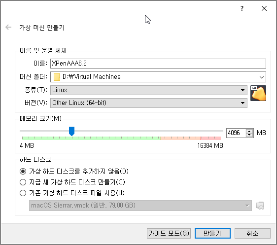 3. VM(Other Linux 64비트 4GB Ram, No HDD) 생성