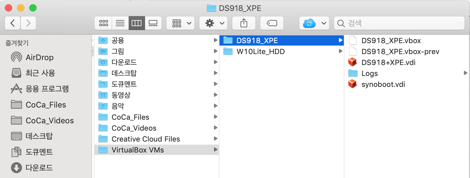 download 폴더에 있는 synoboot.vdi 파일을 라이브러리/VirtualBox VMs/DS918_XPE/ 안으로 이동 또는 복사한다.