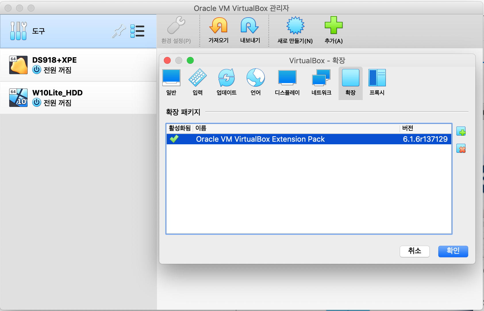 환경설정의 확장 탭에서 + 클릭하여 Oracle_VM_VirtualBox_Extension_Pack-6.1.6.vbox-extpack 파일 설치