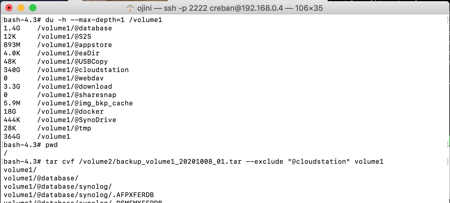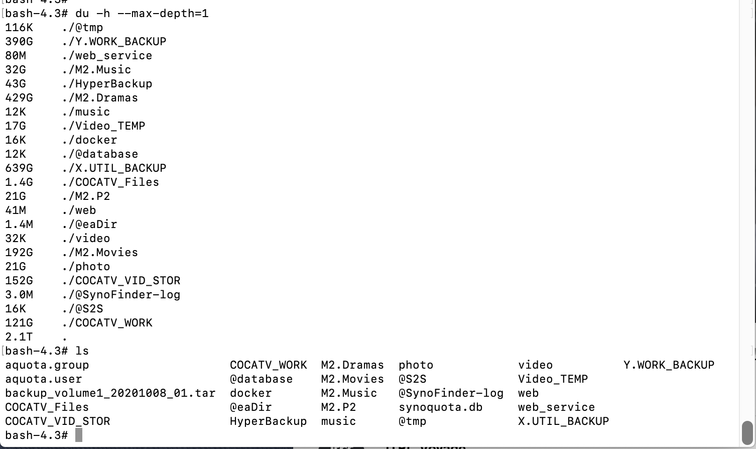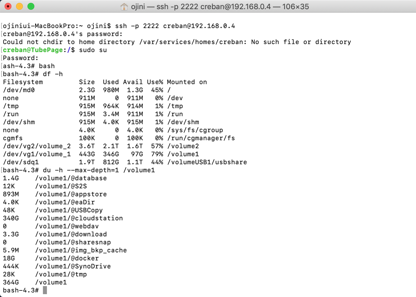 ojiniui-MacBookPro:~ ojini$ ssh -p 2222 creban@192.168.0.4 creban@192.168.0.4's password: Could not chdir to home directory /var/services/homes/creban: No such file or directory creban@TubePage:/$ sudo su Password: ash-4.3# bash bash-4.3# df -h Filesystem Size Used Avail Use% Mounted on /dev/md0 2.3G 980M 1.3G 45% / none 911M 0 911M 0% /dev /tmp 915M 964K 914M 1% /tmp /run 915M 3.4M 911M 1% /run /dev/shm 915M 4.0K 915M 1% /dev/shm none 4.0K 0 4.0K 0% /sys/fs/cgroup cgmfs 100K 0 100K 0% /run/cgmanager/fs /dev/vg2/volume_2 3.6T 2.1T 1.6T 57% /volume2 /dev/vg1/volume_1 443G 346G 97G 79% /volume1 /dev/sdq1 1.9T 812G 1.1T 44% /volumeUSB1/usbshare bash-4.3# du -h --max-depth=1 /volume1 1.4G /volume1/@database 12K /volume1/@S2S 893M /volume1/@appstore 4.0K /volume1/@eaDir 48K /volume1/@USBCopy 340G /volume1/@cloudstation 0 /volume1/@webdav 3.3G /volume1/@download 0 /volume1/@sharesnap 5.9M /volume1/@img_bkp_cache 18G /volume1/@docker 444K /volume1/@SynoDrive 28K /volume1/@tmp 364G /volume1 bash-4.3#