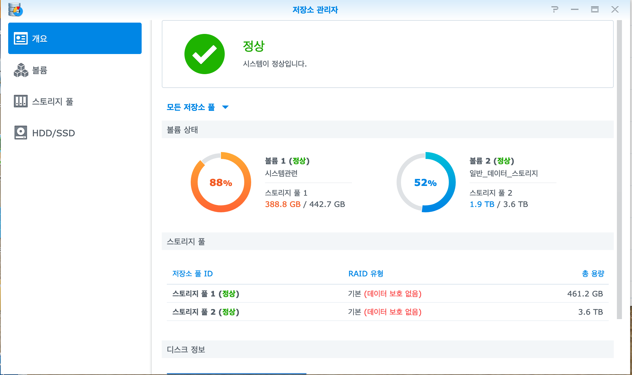 RAID 유형이 기본으로 잡혀 있는 경우는 디스크 별로 저장된 파일이 다를 것 같다는 생각에 "나스의모든것(링크)"의 자료는 참고 하기 힘들었다.