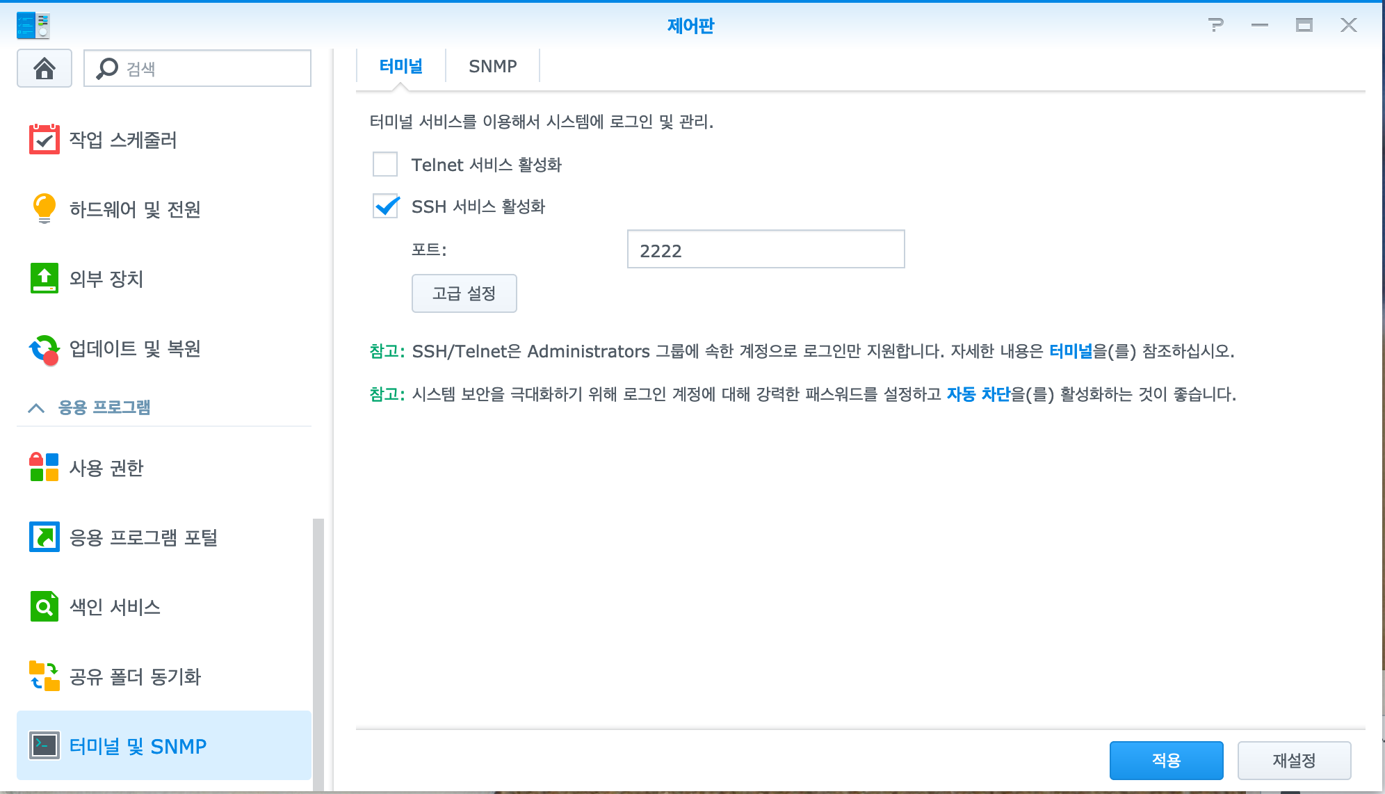 제어판 > 응용 프로그램 > 터미널 및 SNMP > 터미널에서 , SSH 서비스를 활성화하고, 필요에 따라 포트(기본 22)를 변경한다.