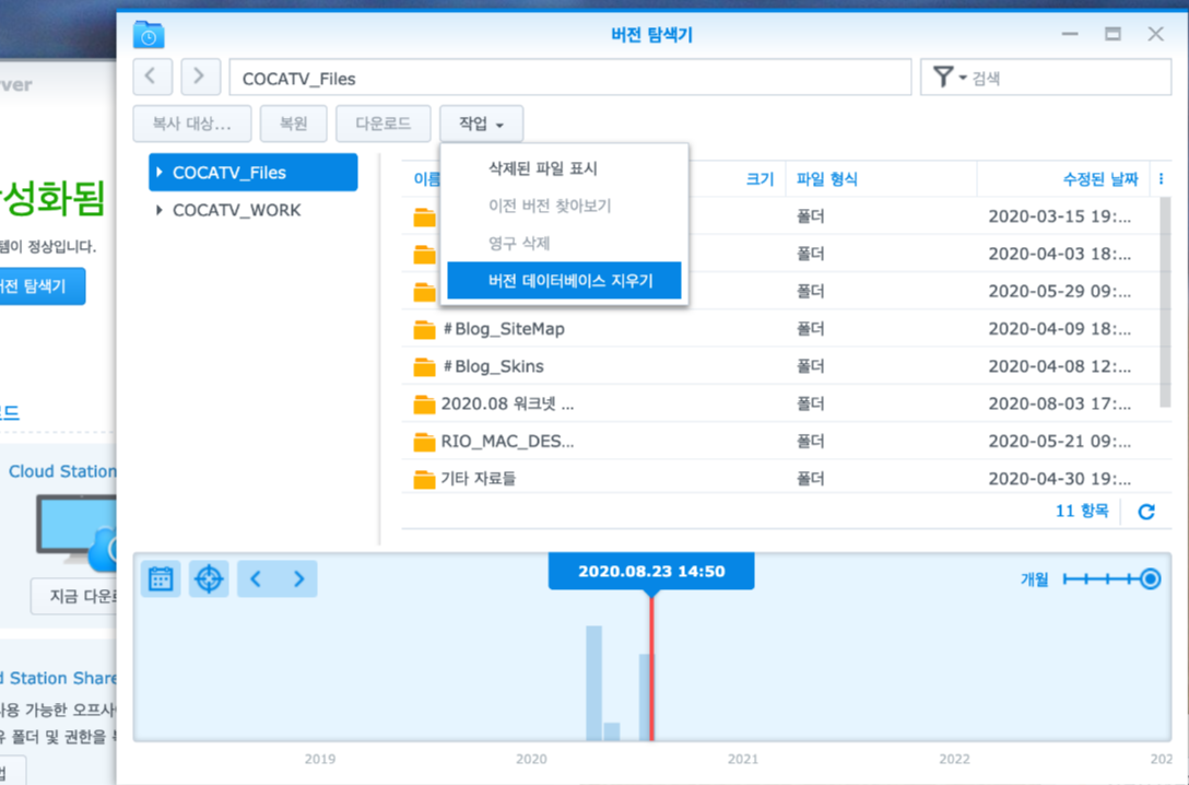 데이터가 있는(막대그래프)를 클릭하고, "공유폴더"를 선택한 후, "작업"에서 "버전 데이터 베이스 지우기" 를 클릭합니다.