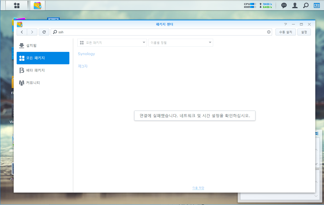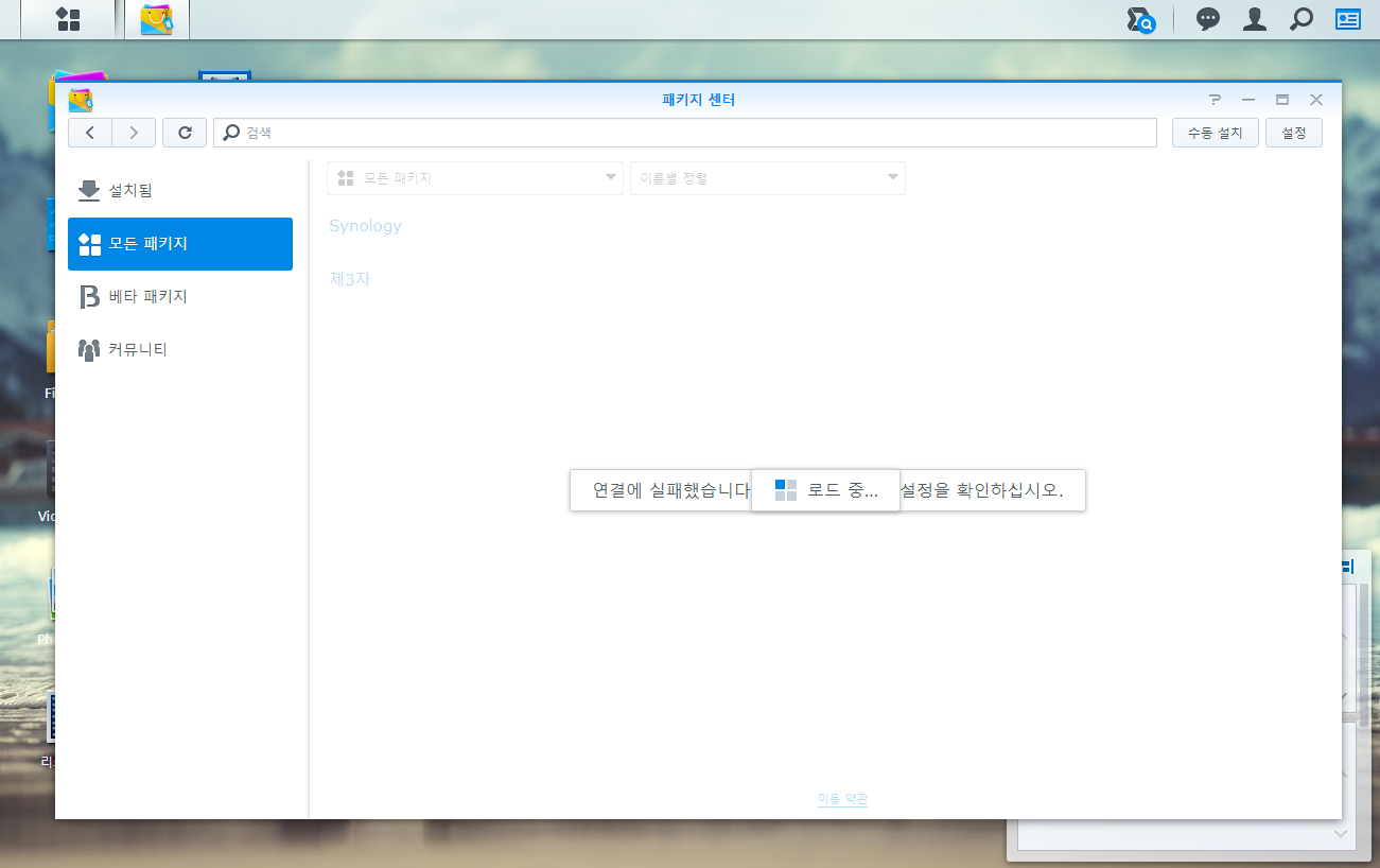 "패키지센터" 연결에 실패했습니다. 네트워크 및 시간 설정을 확인하십시오.
