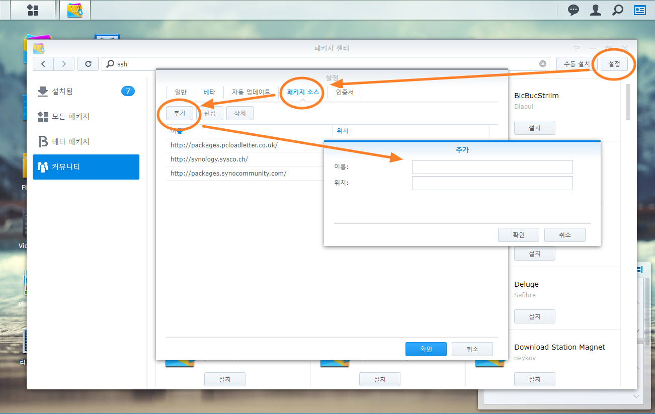 패키지 센터에서 synocommunity 설치 시 잘못된 위치오류로 소스가 추가되지않는 경우라던가